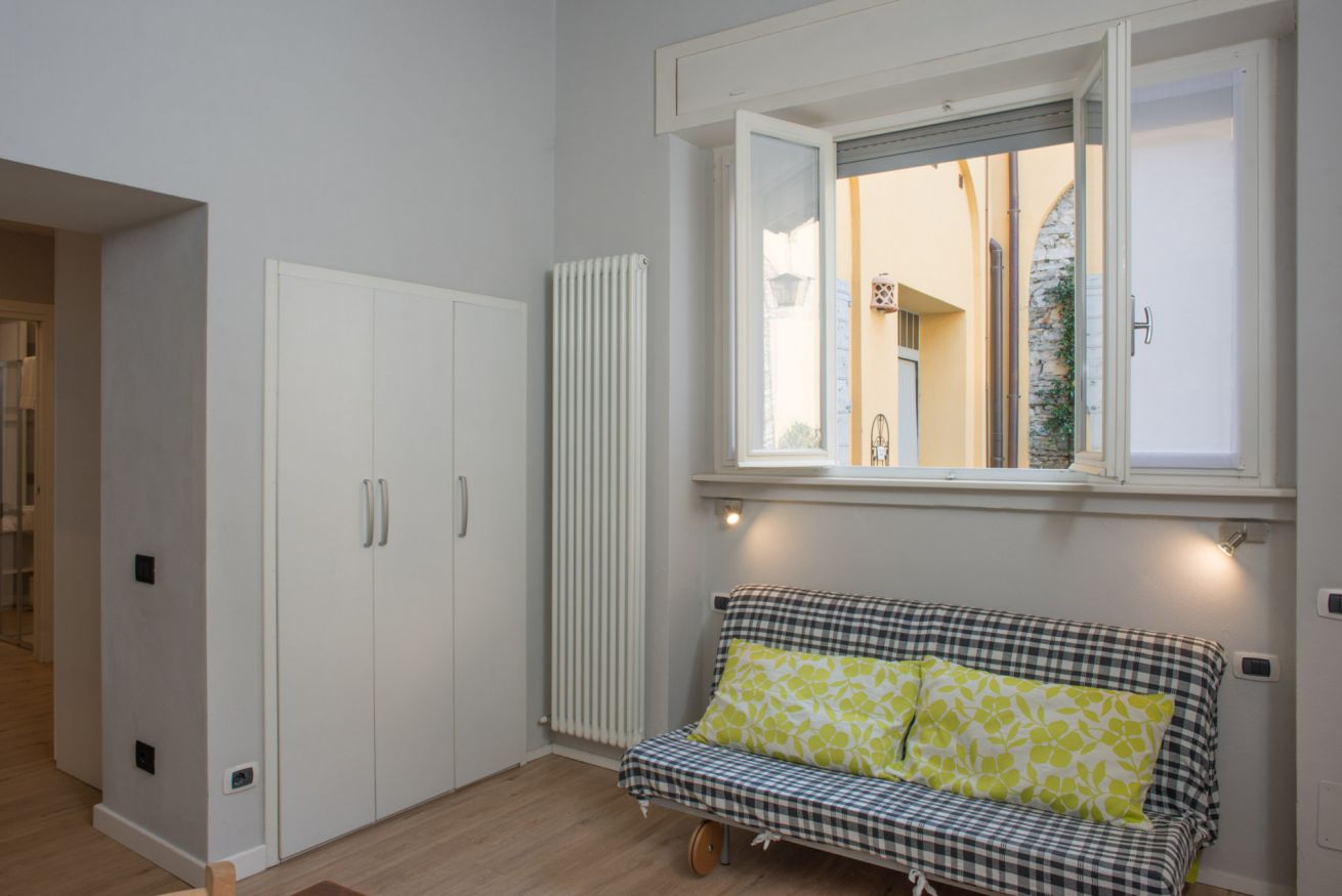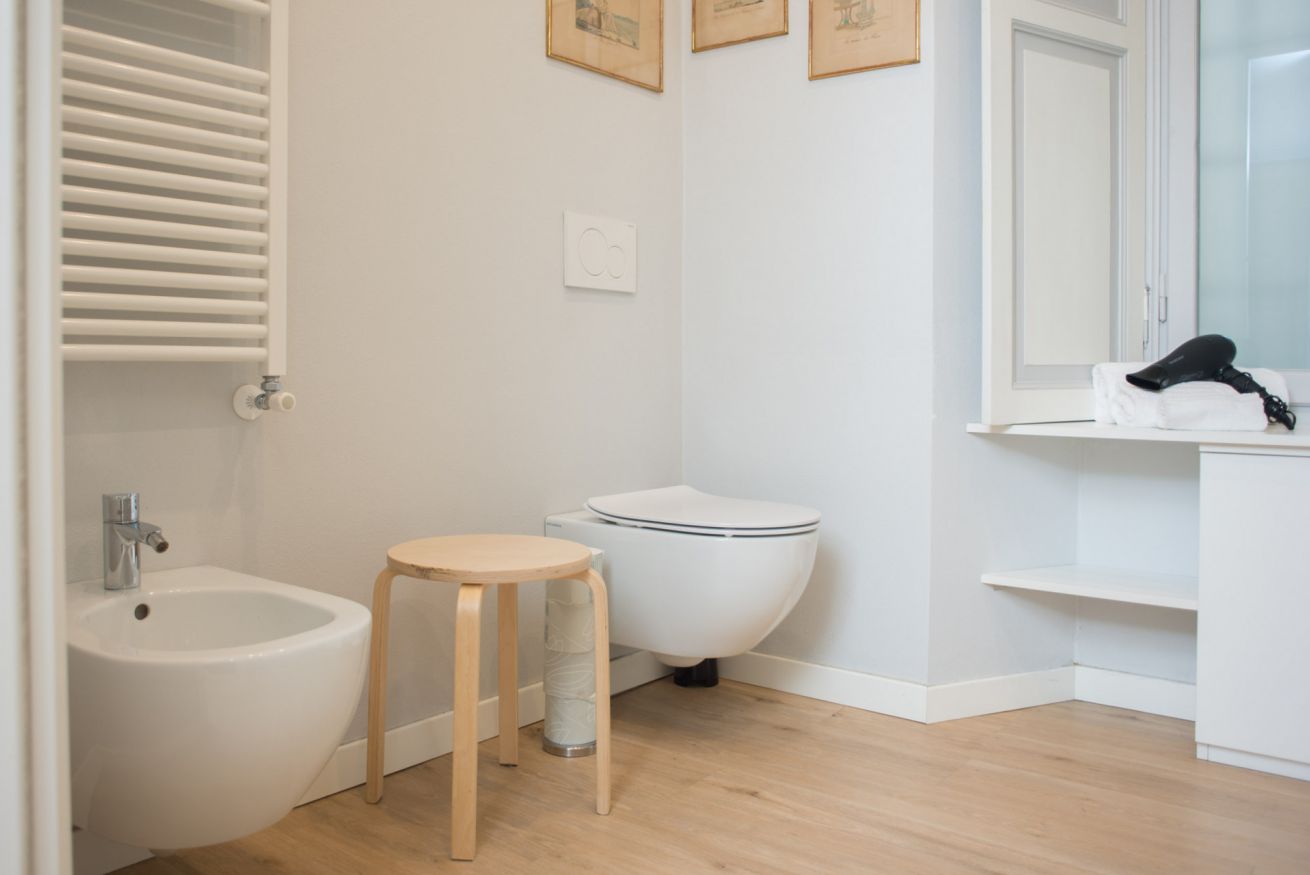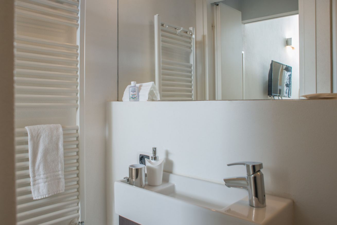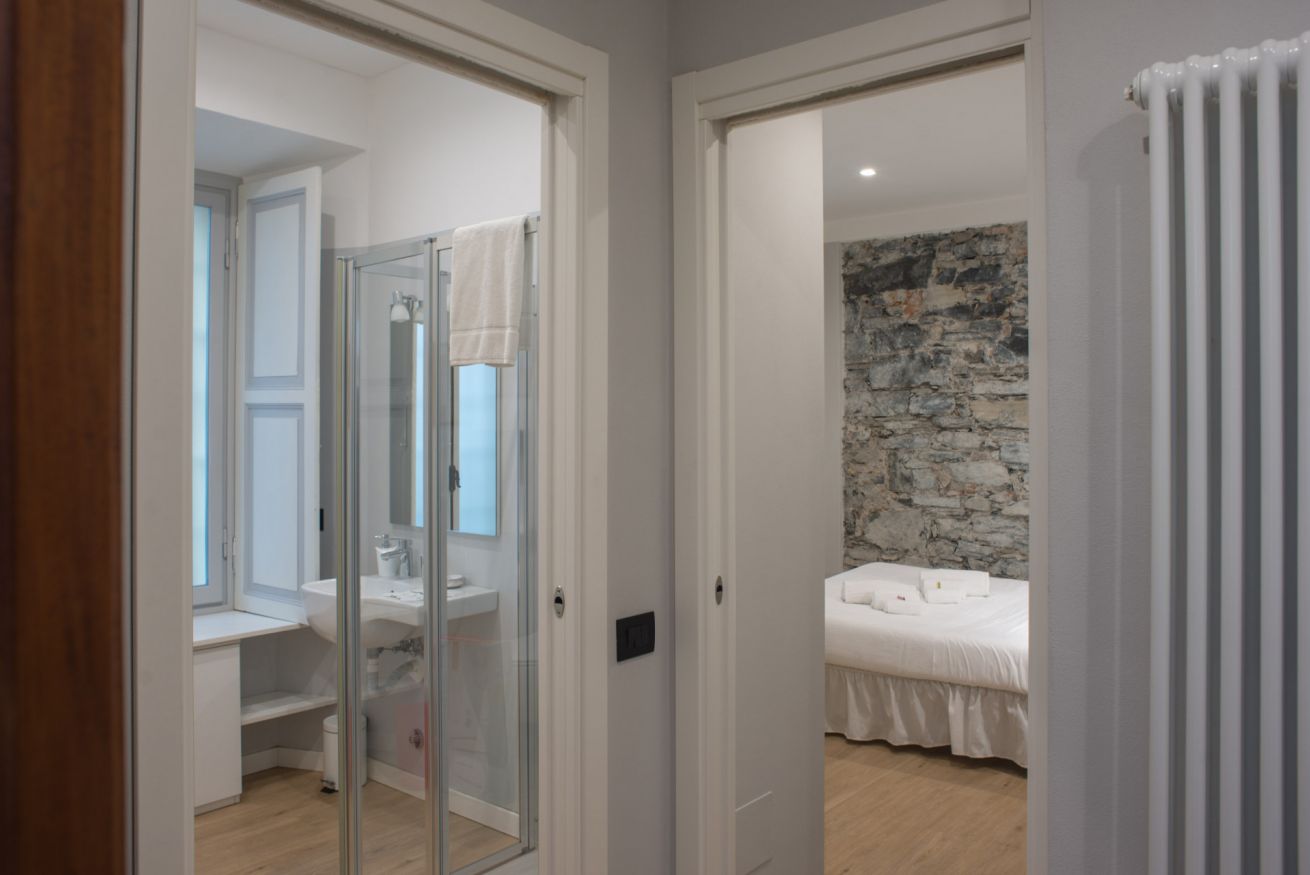 Il trilocale ‘Riva’, a piano terra, è stato ristrutturato cercando di valorizzare gli elementi architettonici originari e di coniugarli con un arredamento moderno e funzionale, in modo da renderlo accessibile anche a persone con difficoltà motorie o disabilità, se aiutate da una terza persona.