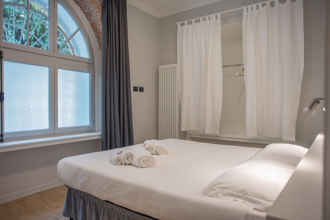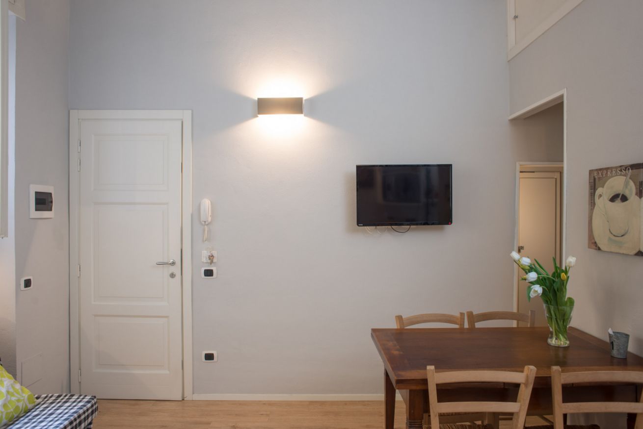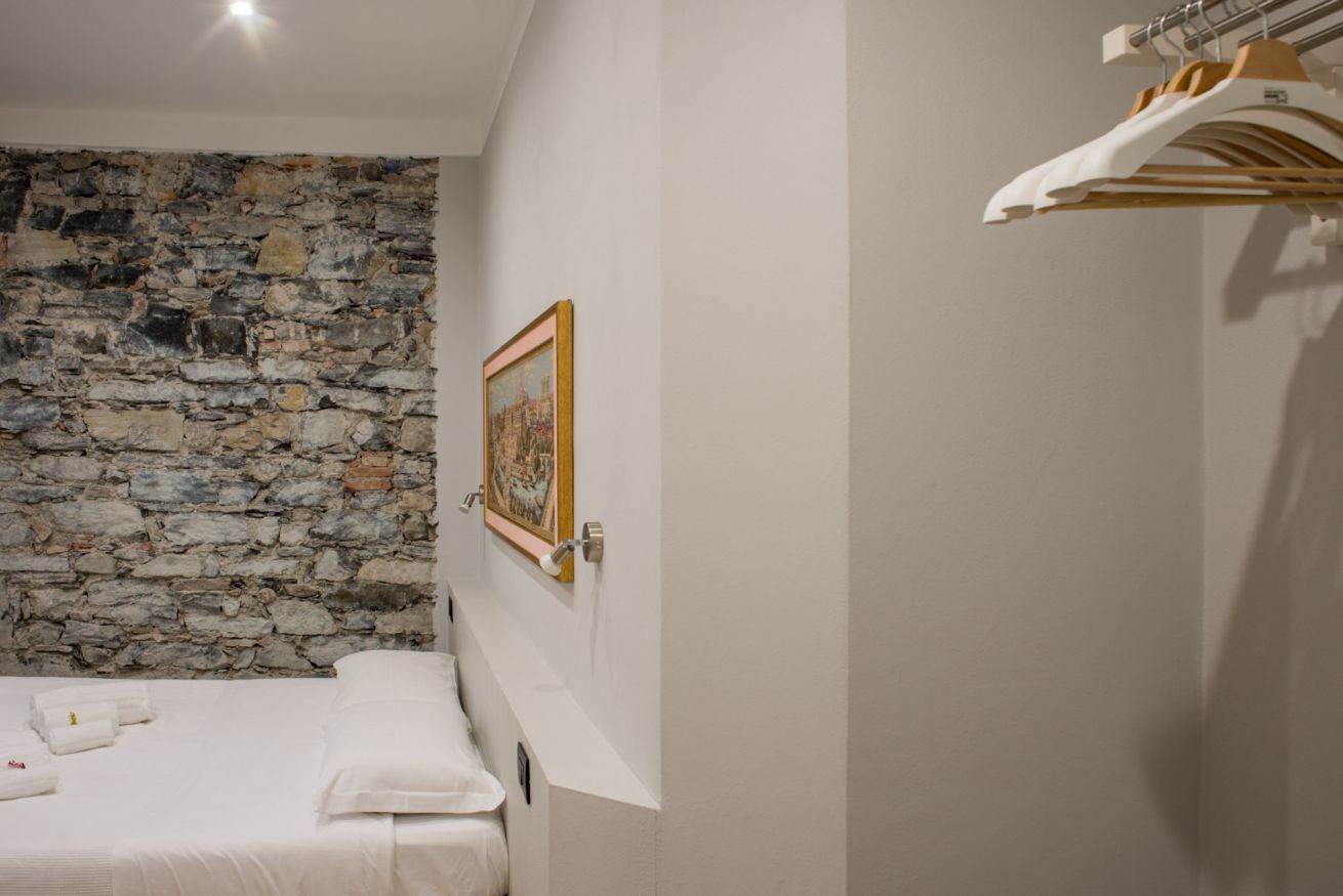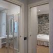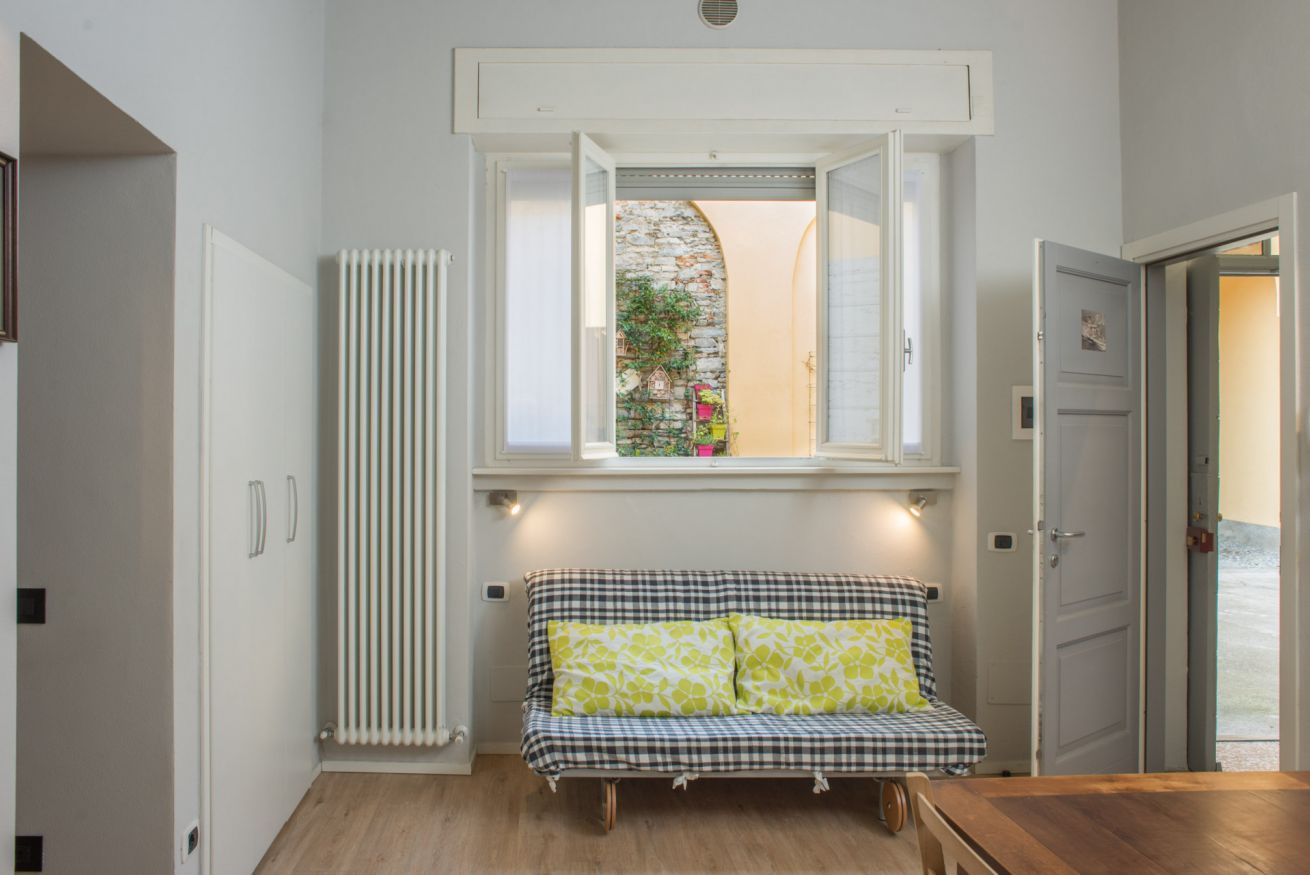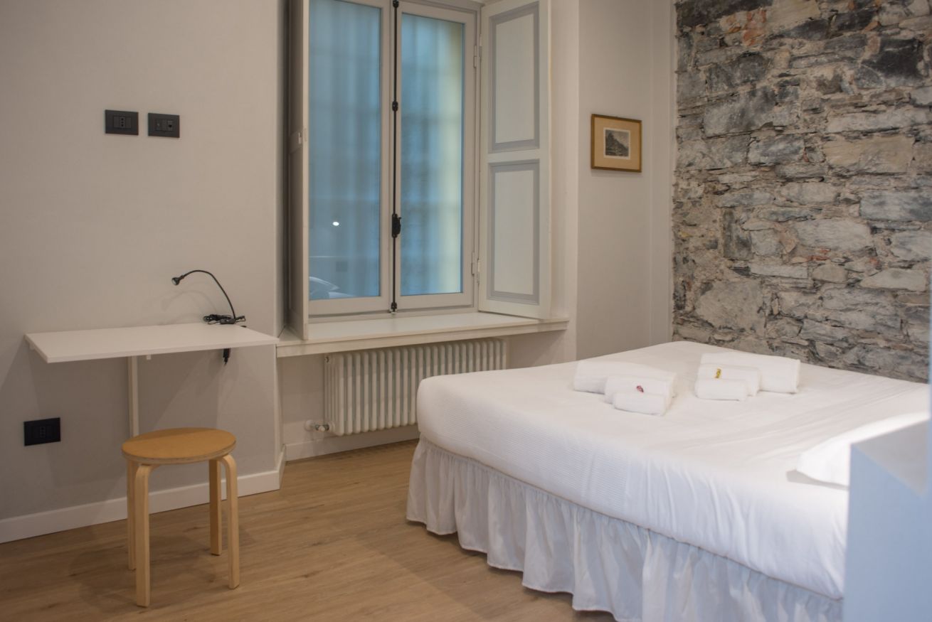 Il trilocale ‘Riva’, a piano terra, è stato ristrutturato cercando di valorizzare gli elementi architettonici originari e di coniugarli con un arredamento moderno e funzionale, in modo da renderlo accessibile anche a persone con difficoltà motorie o disabilità, se aiutate da una terza persona.