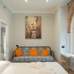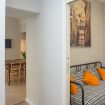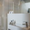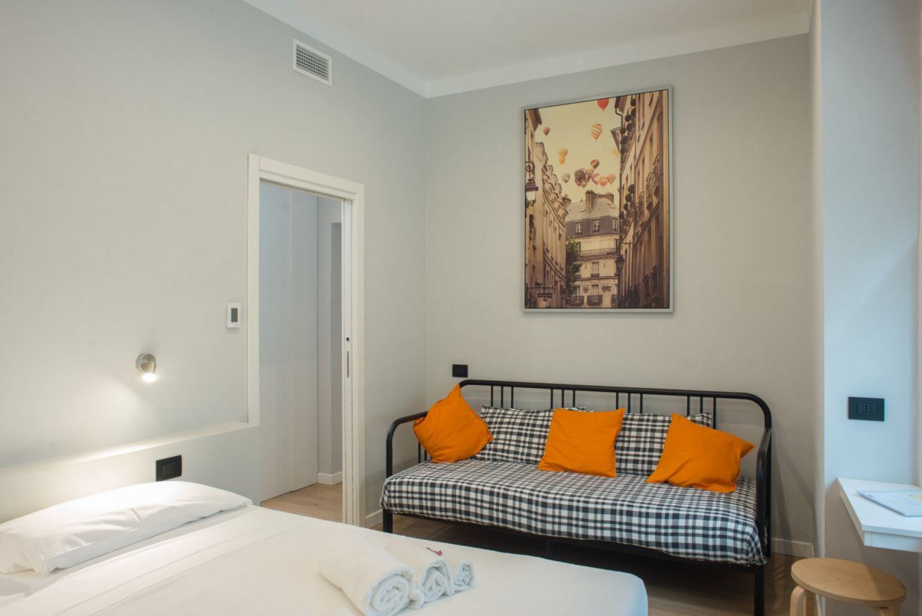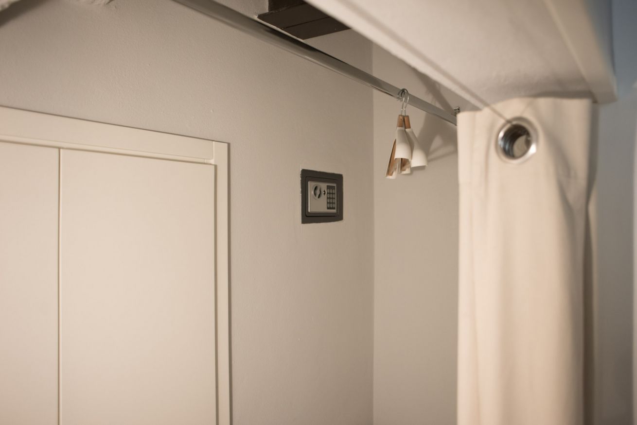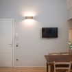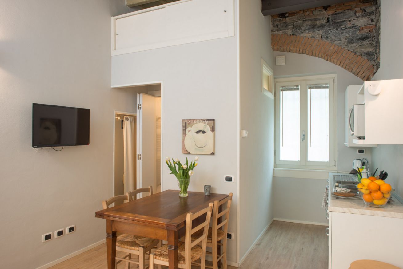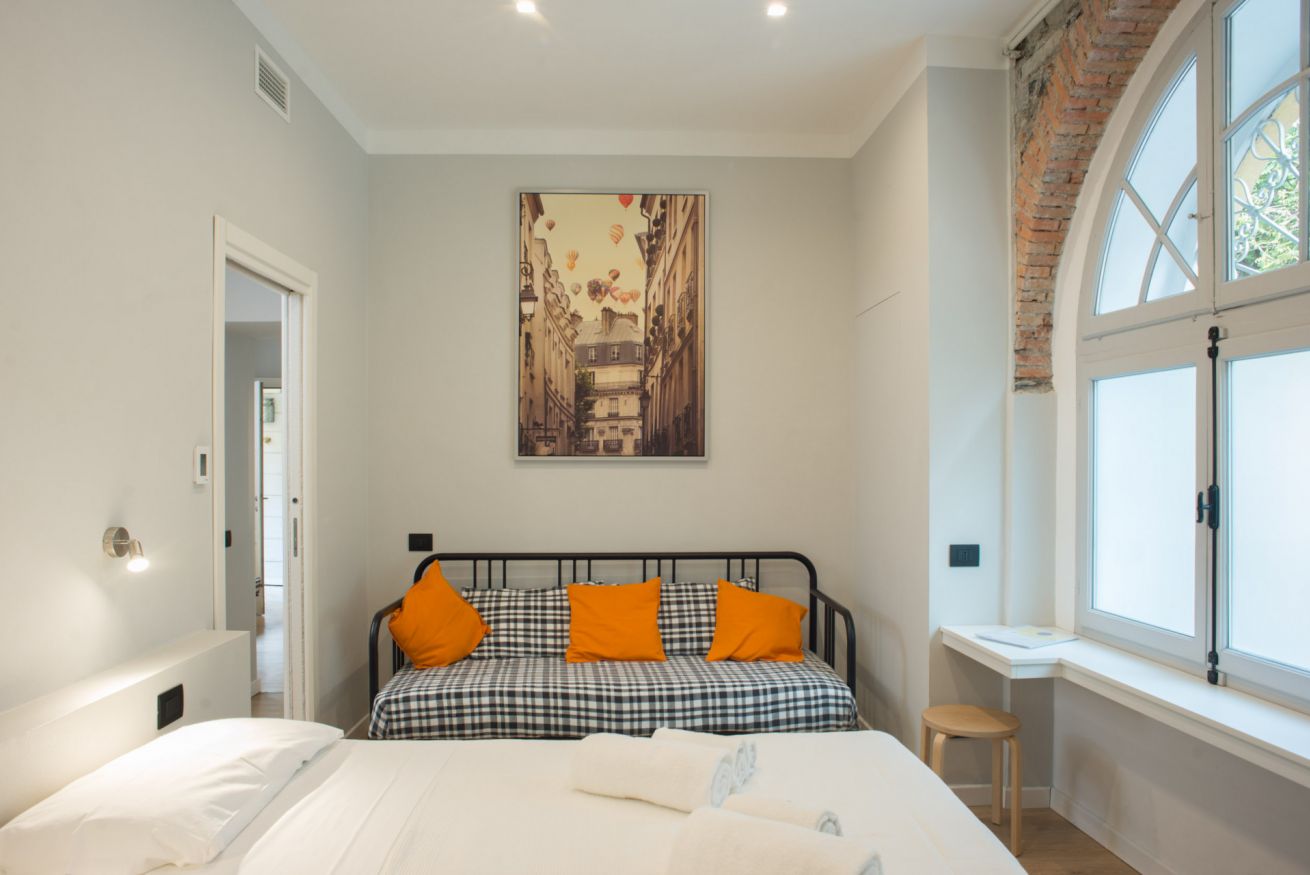 Il trilocale ‘Riva’, a piano terra, è stato ristrutturato cercando di valorizzare gli elementi architettonici originari e di coniugarli con un arredamento moderno e funzionale, in modo da renderlo accessibile anche a persone con difficoltà motorie o disabilità, se aiutate da una terza persona.